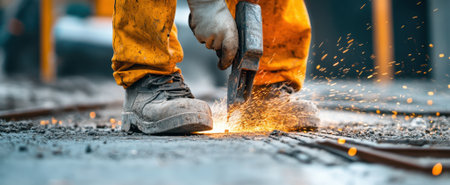A close-up view of a worker using a hammer on railway tracks, creating sparks. The action captures the focus and dedication in construction work, highlighting safety gear.