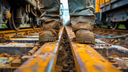 A dedicated construction worker carefully positions rails on a railroad track. The scene captures the hard work and precision involved in the construction process.
