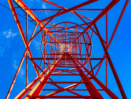 red metal construction - cell tower, against the blue sky, selective focus