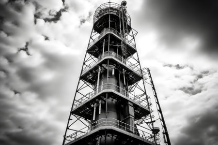 Black and white photo of an industrial chimney against a cloudy sky
