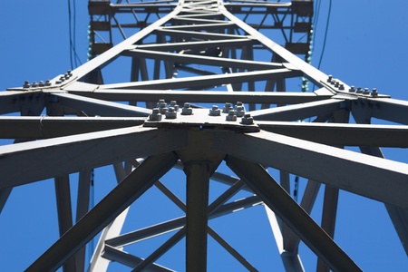 Looking up through an electricity pylon, creating a geometric perspective against a clear blue sky