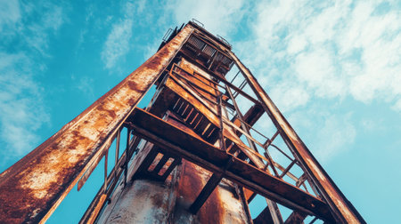 From a striking low angle perspective, an old rusty tower looms high against a clear blue sky. Broken stairs and peeling metal create a raw, industrial allure.