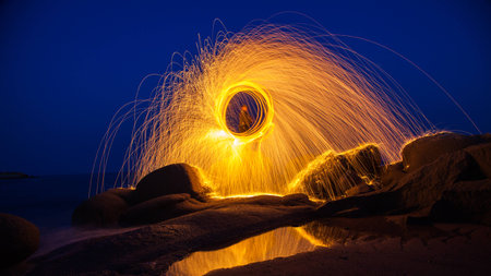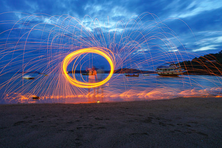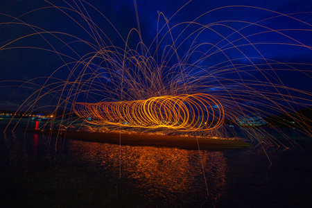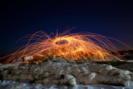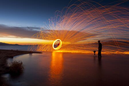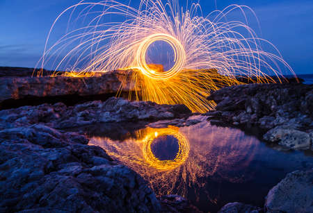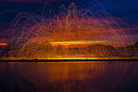 reflection of spark fire swirl from steel wool with long exposure speed motion abstract at sunrise in the sea.