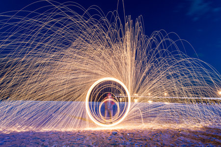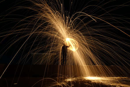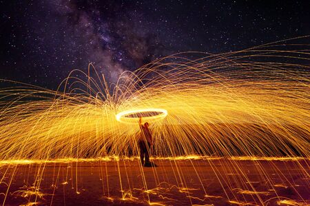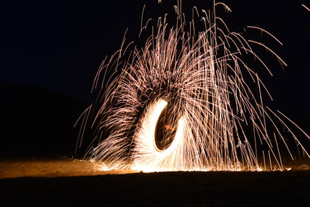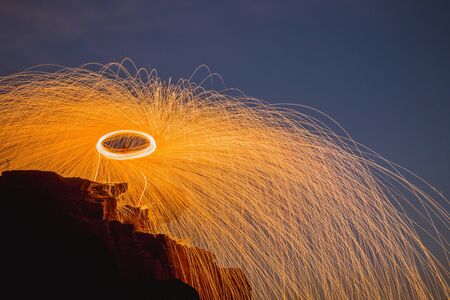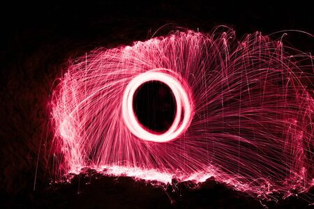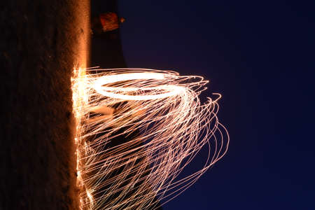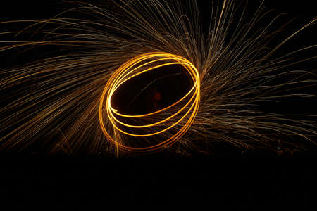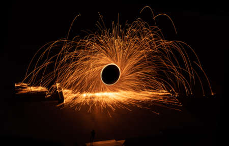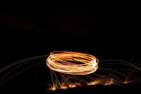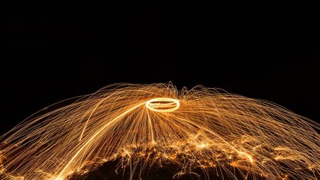 Iron wool circle drawing light fireworks. Burning Steel Wool spinning, Trajectories of burning sparks at night. Movement light effect, steel wool fire hoop. long exposure light painting, Pyrotechnic