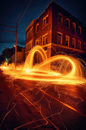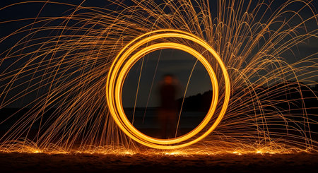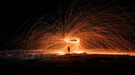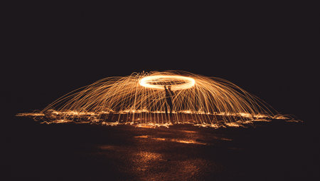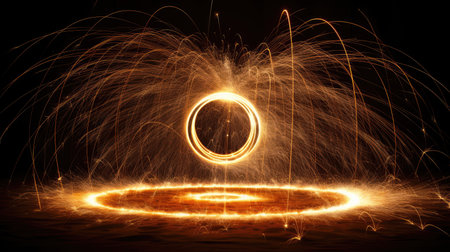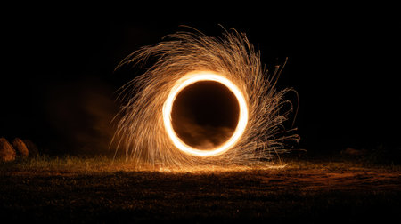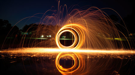 firework drawing iron wool circle. Spinning steel wool that is burning, at night, burning spark trajectories. Steel wool fire hoop effect, movement lighting. pyrotechnics, long exposure light painting. Generative AI