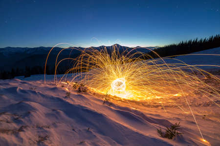 Light painting art. Spinning steel wool in abstract circle, firework showers of bright yellow glowing sparkles on winter snowy valley on mountain ridge and blue night starry sky copy space background.