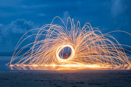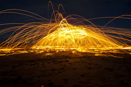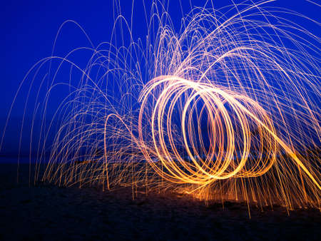 Firework showers of hot glowing sparks from spinning steel wool on the beach.