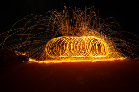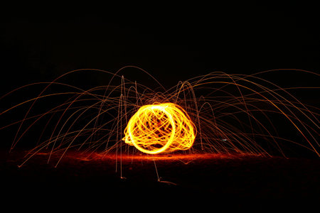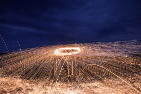 Abstract Image of Burning Wirewool being used to make circle like light trails at Night
