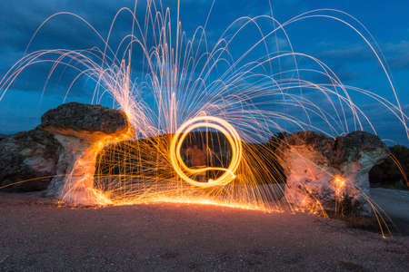 Spinning a lit steel wool between rocks. The circle looks like a portal to another dimension.