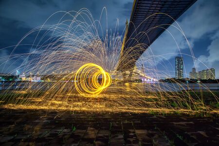 Hot Golden Sparks Flying from Man Spinning Burning Steel Wool under Bhumibol Bridge in Bangkok Thailand., Long Exposure Photography using Steel Wool Burning.