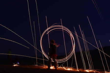 Showers of hot glowing sparks from spinning steel wool at Coney Island Beach, Brooklyn, New York.