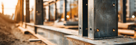 Sunlit steel girders form an intricate lattice, casting golden hues against a blurred industrial sky, highlighting modern construction strength and precision.