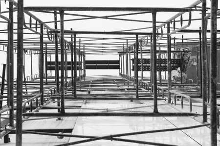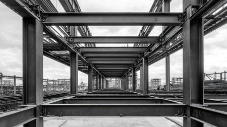 This black and white image showcases a steel structure framework, emphasizing industrial architecture and construction with intricate geometric patterns and strong lines.