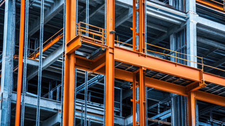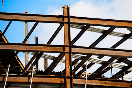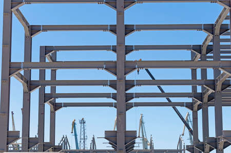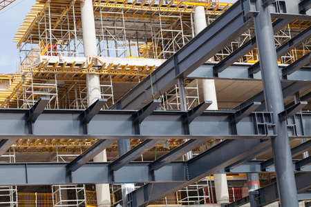 Detailed view of an industrial construction site featuring steel beams and framework under a clear sky, showcasing urban development and engineering progress.