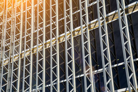 Modern steel framework with metal beams and pipe installation at a construction site during structural building phase outdoors.