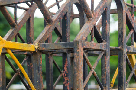 Urban abstract texture background. Point of view looking up in blue sky through old rusty geometric diagonal metal constructions of abandoned building. Horizontal color photography.
