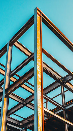 Detailed, low-angle view of a steel framework during construction against a turquoise sky. Rust and gold tones add warmth to the exposed metal beams and supports.