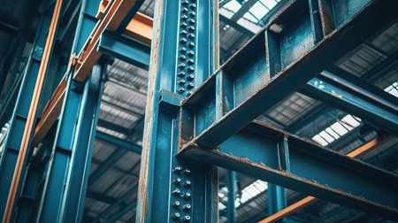 A striking view of an industrial warehouse ceiling showcasing the rustic beauty of steel beams. The photograph emphasizes texture and structural elements, creating a minimalist ambiance.