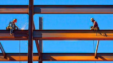 Two skilled workers are engaged in metal construction, welding beams in a building site under a clear blue sky. This image showcases teamwork and craftsmanship in the industrial sector.