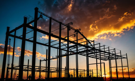 A mesmerizing view of a construction site at dusk, highlighting the illuminated framework against a moody sky, symbolizing modern architecture and urban development.