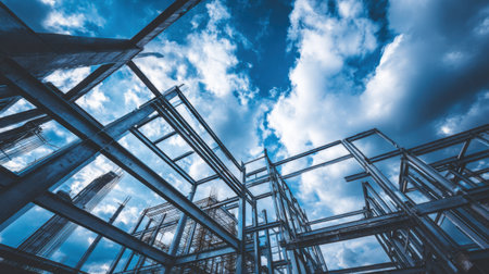 A striking perspective capturing the intricate steel framework of a construction site under a dynamic sky, showcasing the fusion of architecture and nature.