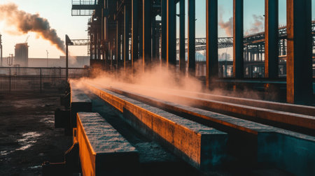 Captivating industrial scene at dawn, featuring steel beams in a factory setting with steam rising, reflecting urban energy and production dynamics.