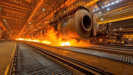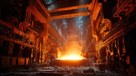 This dynamic image captures the intensity of steel production in an industrial forge, highlighting fiery molten metal and heavy machinery in action.