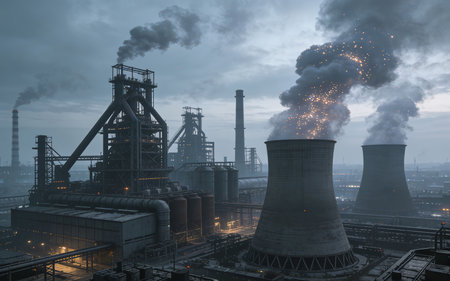 A compelling industrial scene showcasing a steel plant at night, featuring billowing smoke and roaring flames, illustrating the power and intensity of manufacturing processes.