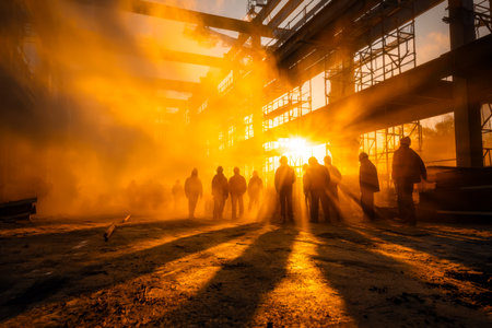 A team of workers cast in shadow against a warm evening sky, surrounded by metal frameworks and rising fumes in a bustling industrial environment.