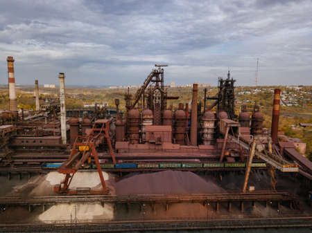 Metallurgical plant with blast furnace, drone aerial view