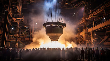 A captivating view of an industrial workshop showcasing large machinery and molten metal being lifted, surrounded by bright lights and smoke.