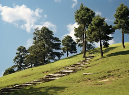 The sun shines brightly over a hill covered in lush green grass, Stone steps leading excited trekkers up a green hill towards the brilliant sun, AI Generated