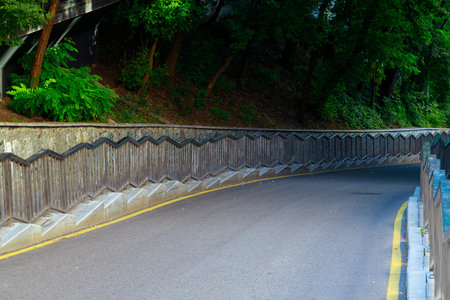 Road in Green forest from top view, have bicycle way and rather curve shape