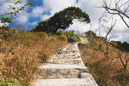 Staircase stairs and hiking walking path way up to Tham Chang Jang karst cave in Vang Vieng Vientiane Province Laos in Southeastasia Asia.