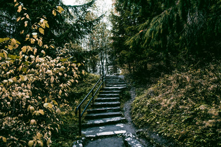 Copy space lifestyle nature green brown Long high old wide staircase low parapet in pine trees forest park. Vintage effect. Step symbol upward to new achievements. Way path route track progress
