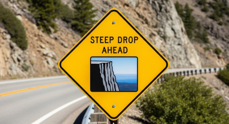 Warning Slope Sign Beside the Road, Yellow Sign to Attention for Downhill Road