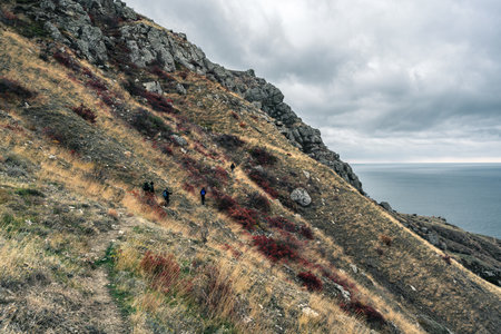 Hiking along a rugged coastal trail with dramatic cliffs and ocean views on a cloudy day