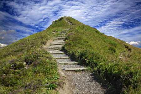 Path to the top of the hill with grass and blue sky.