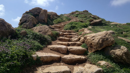 An upward view displays stone steps ascending a rocky hillside. The scene showcases rough-hewn stone steps, surrounded by green plants and large brown rocks under a bright blue sky. The image offers potential for visual storytelling, suitable for various editorial and commercial applications. The composition emphasizes natural textures and outdoor settings.