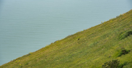 Nature landscape. Green hill and ocean. Edge of cliff