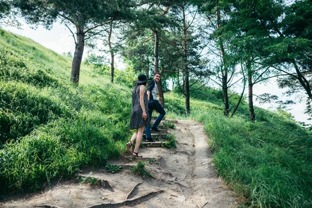 lovely couple climbing up by forest trail