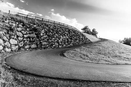 Sharp hairpin curve of narrow rural asphalt road in the mountains. Austrian Alps, Austria. Black and white image.