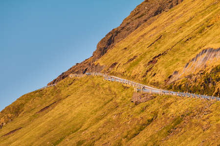 The road is fenced on a steep mountain slope. Beautiful sunset day on Streymoy island. Tjornuvik, Faroe Islands, Denmark.