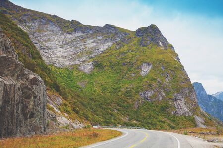 Riding along a winding mountain road. Lofoten Islands, Norway, Europe
