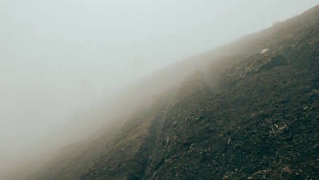 A captivating image showcasing a winding mountain path that meanders through lush greenery, shrouded in fog. This tranquil scene invites adventure and exploration.