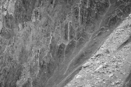 Big mountain cliff under cloudy sky close-up. Beautiful rocky gray textured background with vegetation. Majestic nature.
