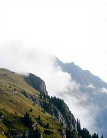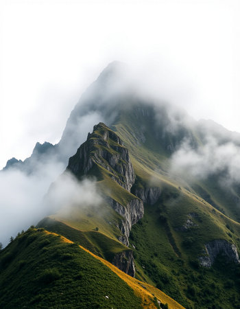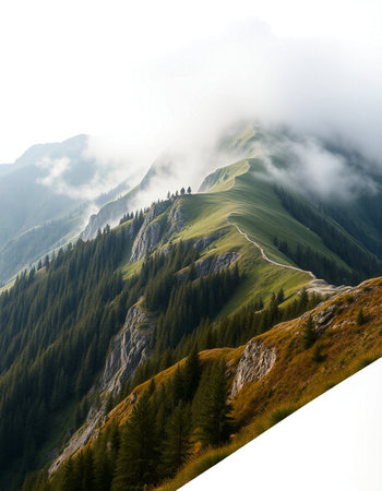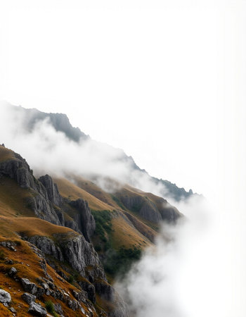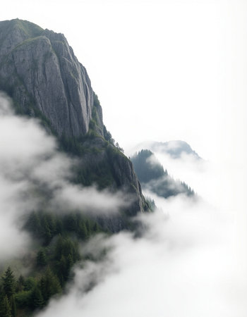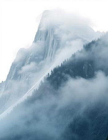 Majestic mountain landscape enveloped in thick fog and clouds, creating an enchanting and mysterious atmosphere for nature lovers.