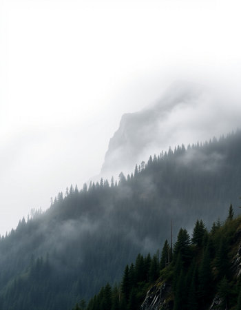 Photography captures snow-dusted mountain peaks partially obscured by mist, framed by lush evergreen trees, evoking a calm and minimalistic ambiance