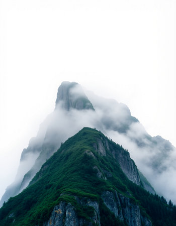 A stunning view of a solitary mountain peak enveloped in mist and fog. The serene landscape embodies tranquility, making it perfect for nature enthusiasts and wanderers.