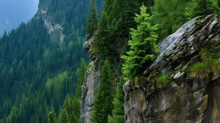 Explore a breathtaking mountain scene featuring towering rocky cliffs adorned with vibrant green pine trees, epitomizing the beauty of nature.